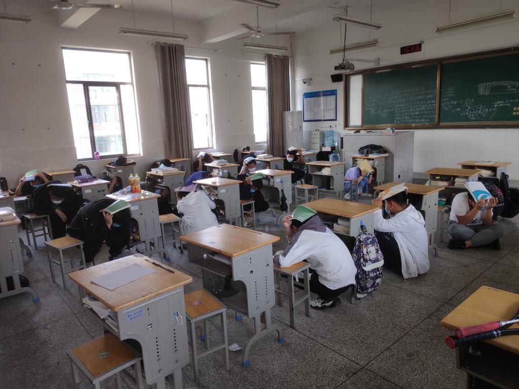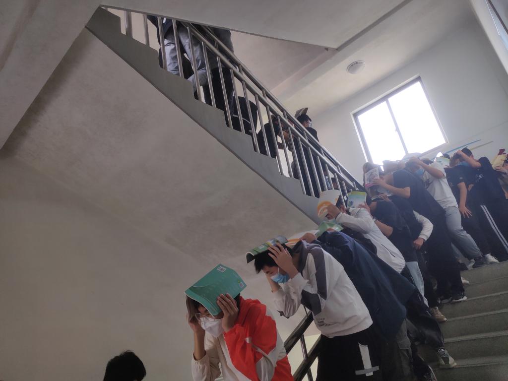 演练前赵成栋主任召集各位班主任就疏散演练方案作了说明,王海波主任对怎样完成演练进行了部署并提出了相关要求,对全体学生作了动员。 下午第三课,教室的广播宣布地震防灾演练正式开始。各楼层负责人通知所属班级,班级学生开始避险。学生迅速用书本或者书包等掩盖头部,躲在课桌底下,等待时机疏散。等一波地震过去后,同学们在老师的带领下有组织地疏散,沿着规划的逃生路线,有序逃离灾难现场,楼梯口负责人在楼梯口疏散学生,指引疏散方向,防止学生拥挤,保障学生安全。学生们随后快速地撤离到学校宽阔的主干道上。撤离到广场后,以班集体为单位,每班班长清点逃离出来的同学,并把人数汇报给现场指挥赵成栋主任。至此,防灾疏散演练结束。学校通过这种紧张又有趣的方式,将防灾减灾的宣传教育深入了每一位同学的心中。