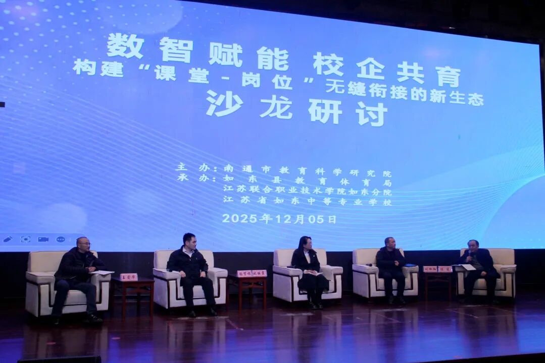 压轴登场的是校企沙龙,主题为:“数智赋能、校企共育,构建‘课堂—岗位’无缝衔接新生态”。在南通市教科院王爱华主任的主持下,张家港中专校长姚丽霞、中天科技集团数字化部总经理张贤根、今政软件公司总经理刘松柏、如东中专副校长陈建展开对话。